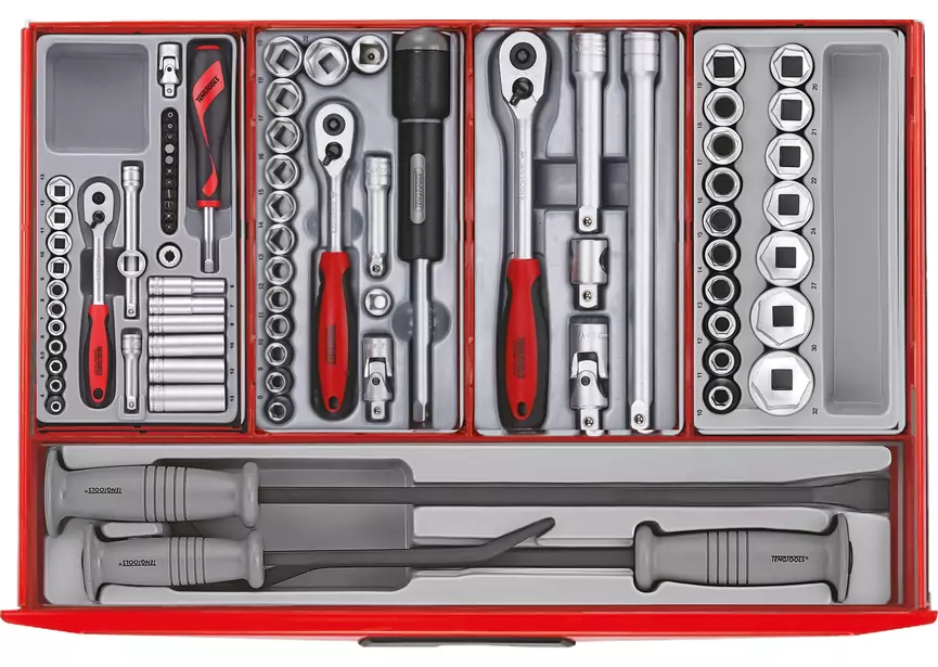 Set d’embouts avec manche à cliquet et accessoires 69 embouts plats, Philips, Pozidrive, Torx, Torx perçés, Hexagonal, GR, carrés 1 rallonge 100 mm 1 rallonge flexible 150 mm 2 adaptateurs 1/4″ Tiroir 3: TT02 – TTPC09 – TTD914N – TTXF05 2 burins 150 et 200 mm 6 chasses-goupilles 3 – 8 mm 1 pointe 150 mm 6 tournevis plats 3 – 3,5 – 5,5 (x2) – 6,5 (x2) mm 4 tournevis Philips PH0 – PH1 – PH2 (x2) 4 tournevis Pozidriv PZ0 – PZ1 – PZ2 (x2) 5 limes d’une longueur de 250 mm 1 lime ronde – Bâtarde, rasp-cut 1 lime demi-ronde – Bâtarde, double-cut 1 lime triangulaire – Bâtarde, double-cut 1 lime plate – Bâtarde, double-cut 1 lime plate – Douce, double-cut Tiroir 4: TTHEX7 – TTTX7 – TT474-7 – TT440-T – TTX00 7 clés Allen avec manche en T 2,5 – 3 – 4 – 5 – 6 – 7 – 8 mm Tête sphérique du coté long de la clé 7 clés Torx et Torx perçé avec manche en T T10 – T15 – T20 – T25 – T27 – T30 – T40 Torx perçé TPX du coté court de la clé Set de 4 pinces circlips Interne droite 12 – 65 mm Externe droite 10 – 40 mm Courbée interne 12 – 65 mm Courbée externe 10 – 40 mm 4 grandes pinces 1 pince multiprise 1 pince coupante 1 pince à long bec 1 pince universelle Tiroir 5: TTPS09E – TTX00 Latte de mesure mm/inch 200 mm Cutter Marteau DIN1041 800 gr Marteau avec tête en nylon et caoutchouc Scie à métaux Mètre à ruban 3 m Pince étau 2 clés à molette
