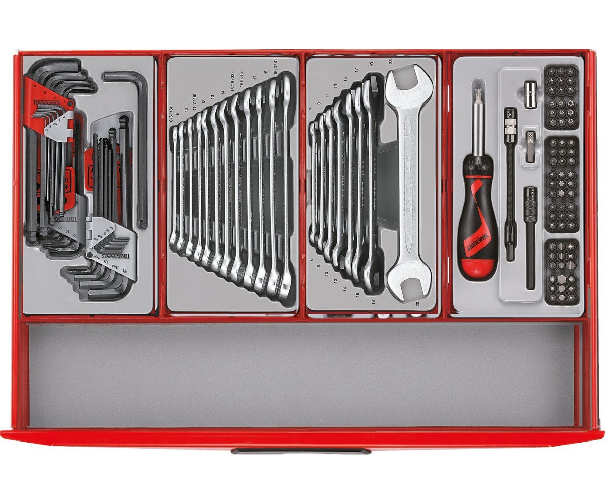 Dieses Mini Master Tools Set besteht aus einem kompletten Werkzeugsortiment, organisiert im einzigartigen Teng Tools System, alles aufbewahrt in einem Werkstattwagen mit 7 Schubladen.