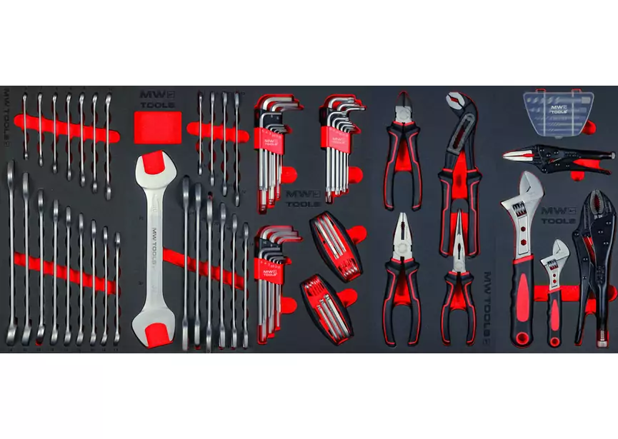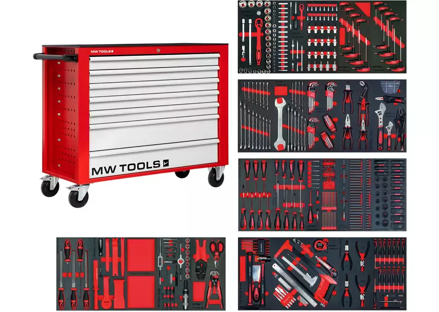Diese Werkzeuge werden im breiten (945 mm) Werkzeugwagen GW307 mit 7 Schubladen geliefert, ausgestattet mit 2 großen Aufbewahrungsschubladen.